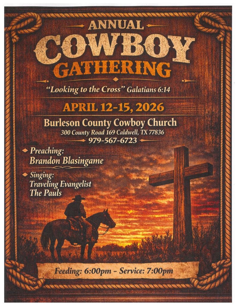 " At Burleson County Cowboy Church, you are invited to come as you are. Come fellowship and worship in a relaxed atmosphere with a bunch of loving cowboys and cowgirls without any barriers. Our dress is laid back and comfortable. Our prayer is that anyone who comes will feel welcome in the presence of the Holy Spirit and the love of Christ. So if you are looking for a church home loves people, come try Burleson County Cowboy Church. . God Bless" -- Bro. Harvey Abke